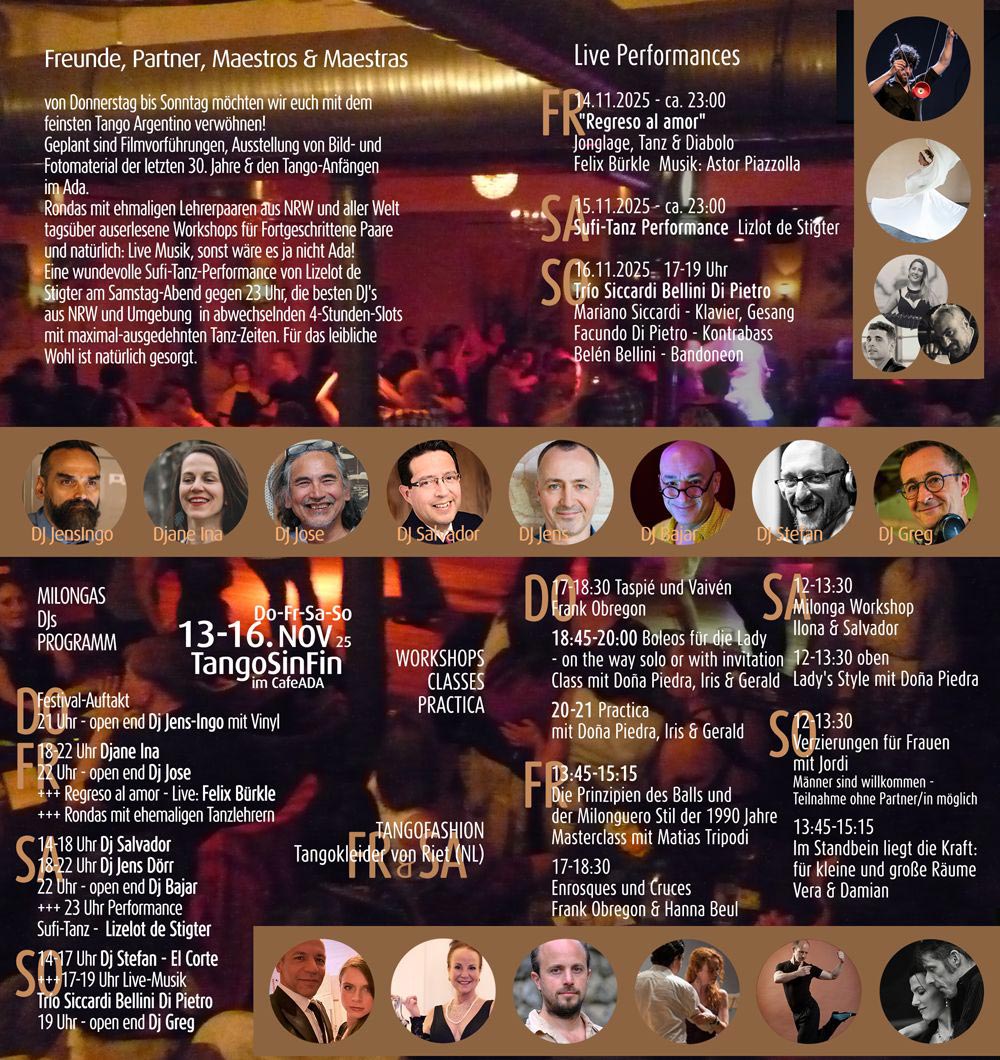 30 Jahre ADA Freunde, Partner, Maestras & Maestros – Von Donnerstag bis Sonntag möchten wir euch mit dem feinsten Tango Argentino verwöhnen! Geplant sind Filmvorführungen, Ausstellung von Bild- und Fotomaterial der letzten 30. Jahre & den Tango-Anfängen im ADA Rondas mit ehmaligen Lehrerpaaren aus NRW und aller Welt tagsüber auserlesene Workshops für Fortgeschrittene Paare und natürlich: Live Musik, sonst wäre es ja nicht ADA! Eine wundevolle Sufi-Tanz-Performance von Lizelot de Stigter am Samstag-Abend gegen 23 Uhr (15.November) die besten DJ's aus NRW und Umgebung in abwechselnden 4-Stunden-Slots mit maximal ausgedehnten Tanz-Zeiten: Festival-ProgrammDonnerstag, 13.November, 20:30 bis open-end - 1 DJ Freitag, 14. November, 18 Uhr bis open-end - 2 DJs Samstag 15. November, 14 Uhr bis open-end - 3 DJs Sonntag 16. November, 14 Uhr bis open-end - 2 DJs
